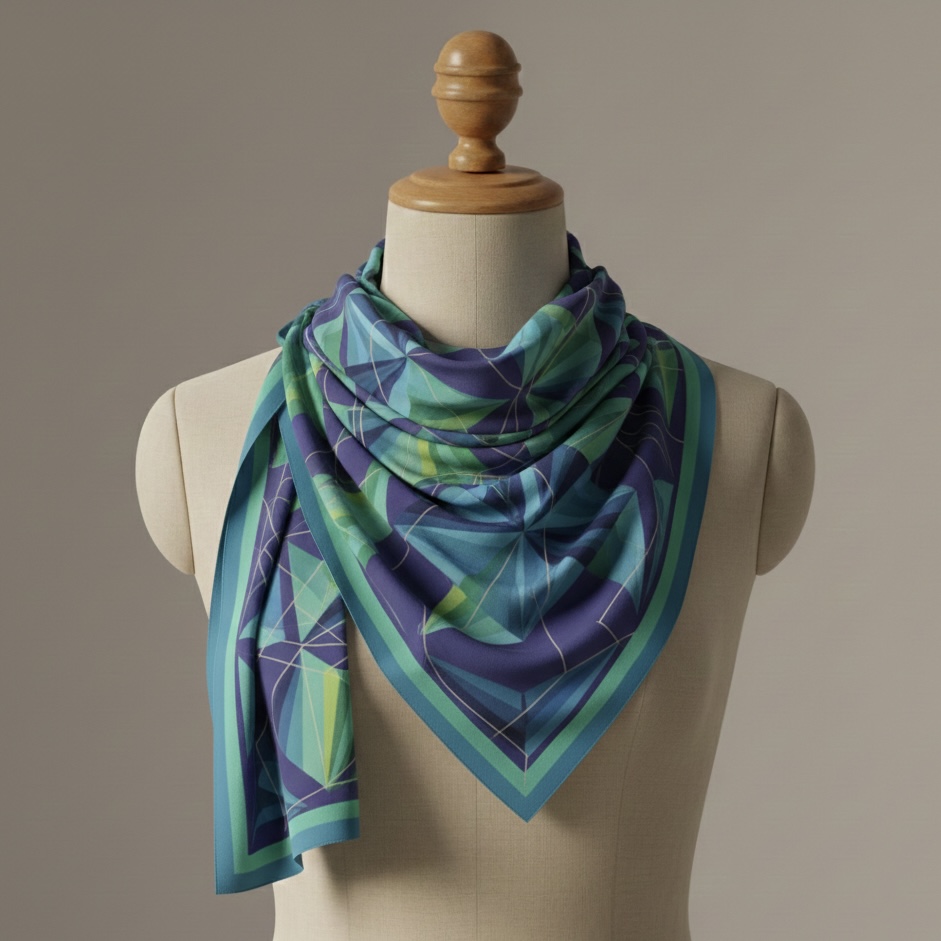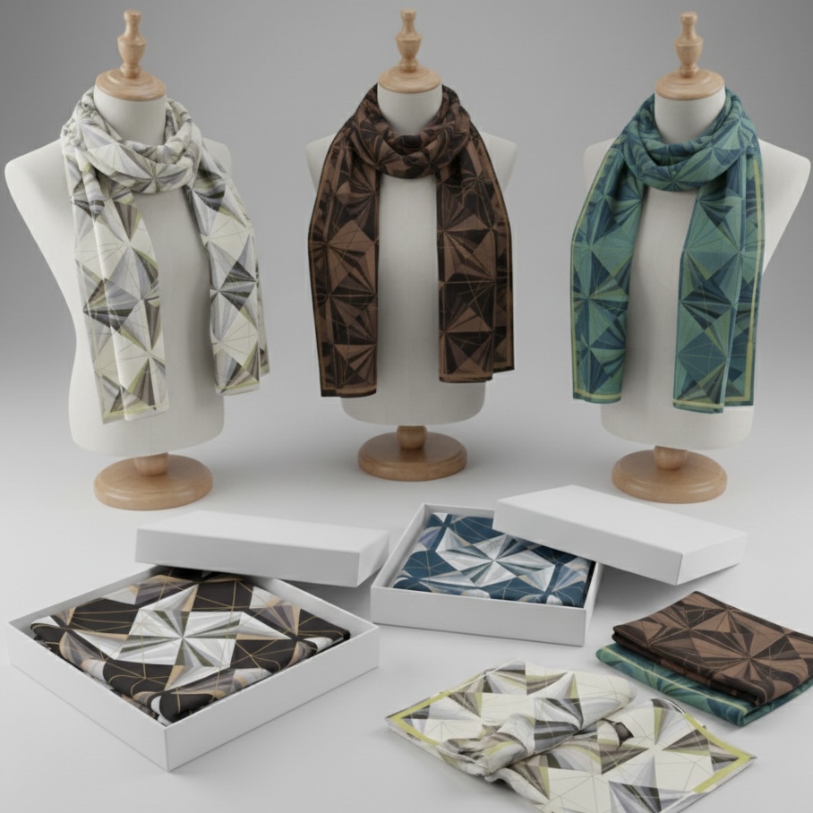 The scarf becomes a living surface. As it drapes, folds, and shifts, the geometry evolves. Angles soften, lines bend, and colour interacts with the wearer’s motion, creating ever-changing compositions. What was once fixed in wood becomes fluid in air.