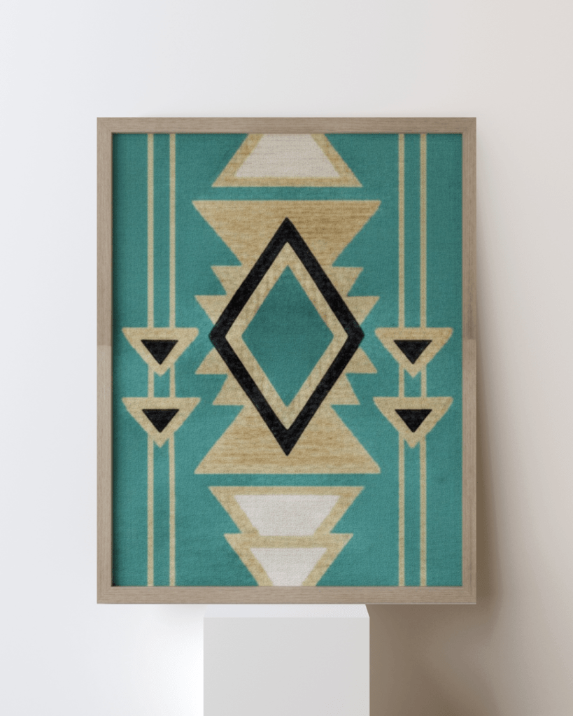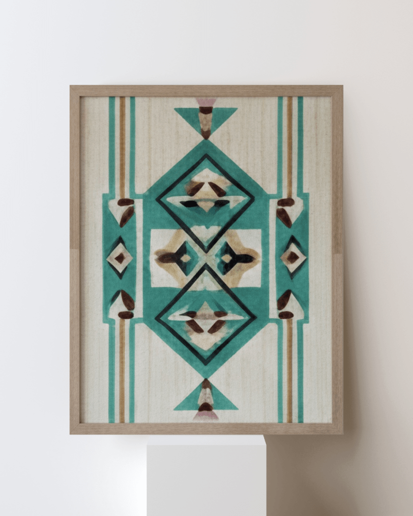 Balance Field expands upon the central motifs of the series by introducing a wider, more complex field of interaction. While earlier studies like Still Axis focused on a single anchor, Balance Field distributes weight across the entire plane. The composition utilizes mirrored teal diamonds and earthy, hand-rendered accents to create a sense of symmetry that feels “alive” rather than mechanical. It is a visual representation of the push-and-pull between human intent and the natural behavior of the timber substrate.