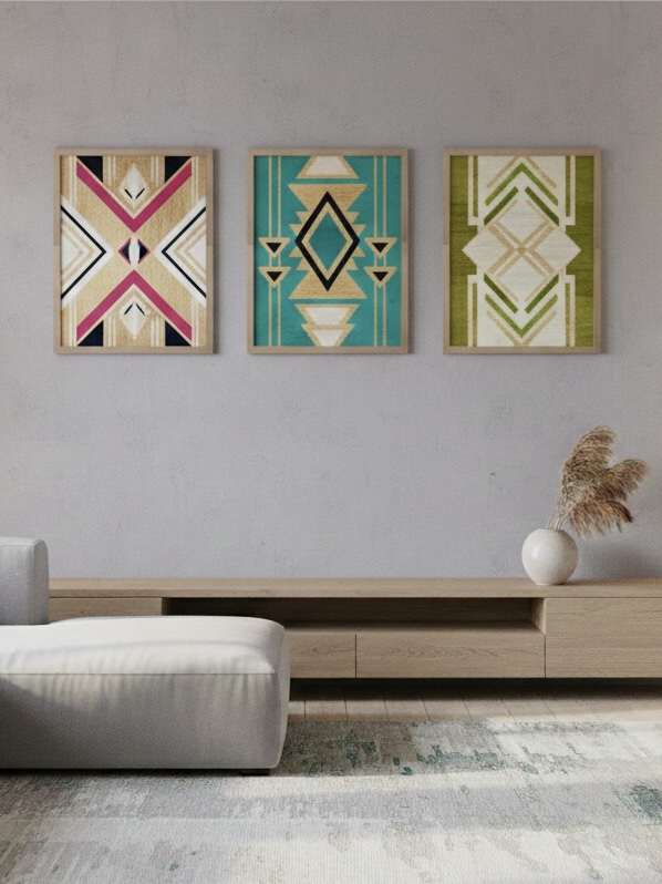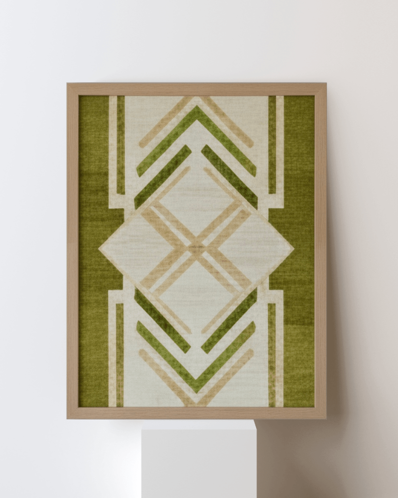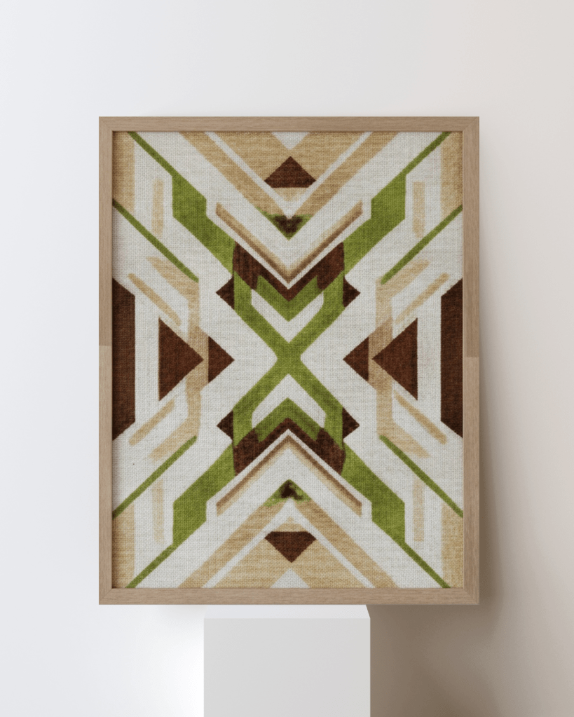In this work, the plywood is not merely a substrate but a primary collaborator. The composition utilizes a rigid, symmetrical framework of diamonds and chevrons to provide a sense of architectural stability. This precision is intentionally softened by a palette of moss greens, olives, and sandy ochres tones that echo the wood’s botanical origins.